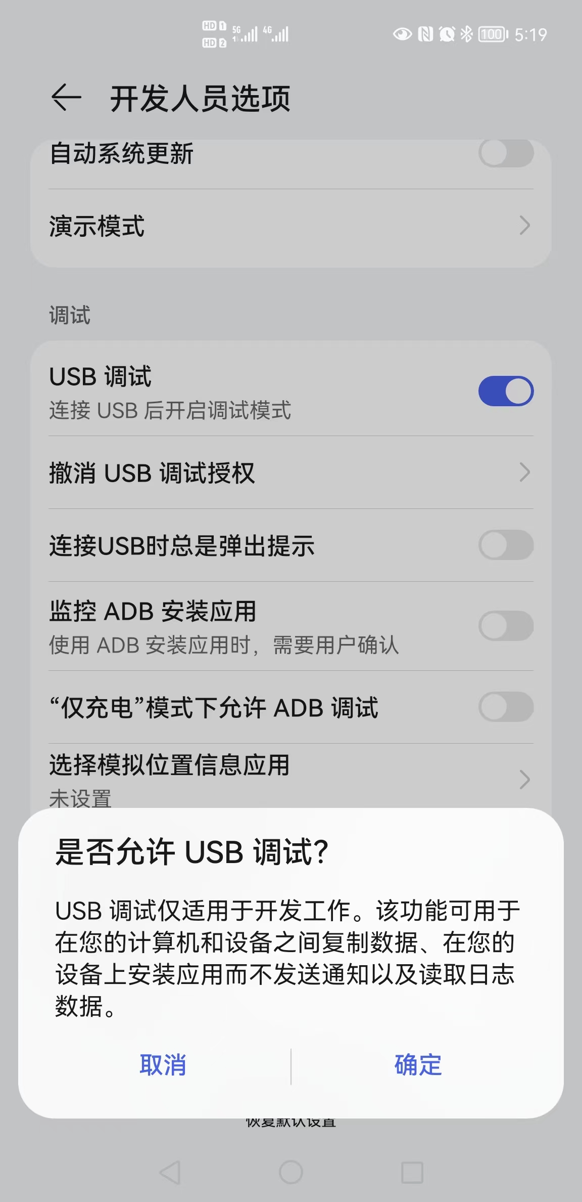 首先请用数据线连接您的设备,并打开设备的开发者人员选项,勾选USB调试。下面以华为mate40为例: