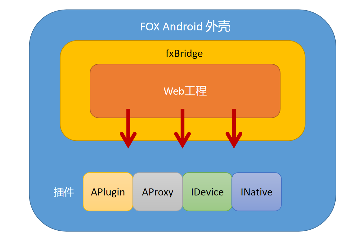 使用本外壳开发出来的APP是一个由FOX前端工程、Android外壳两部分共同驱动的应用。 在开发中只需要专注于您的前端工程页面和业务逻辑,Andorid外壳中已经集成了十分丰富的插件和驱动,随时可供页面调用,除了支持普通设备中使用相机拍照, 查看和上传文件,录音录像等,还支持第三方硬件设备进行兼容,例如密码键盘,指纹仪,身份证读取器等等。另外,还可以方便的集成其他厂商提供的第三方SDK。