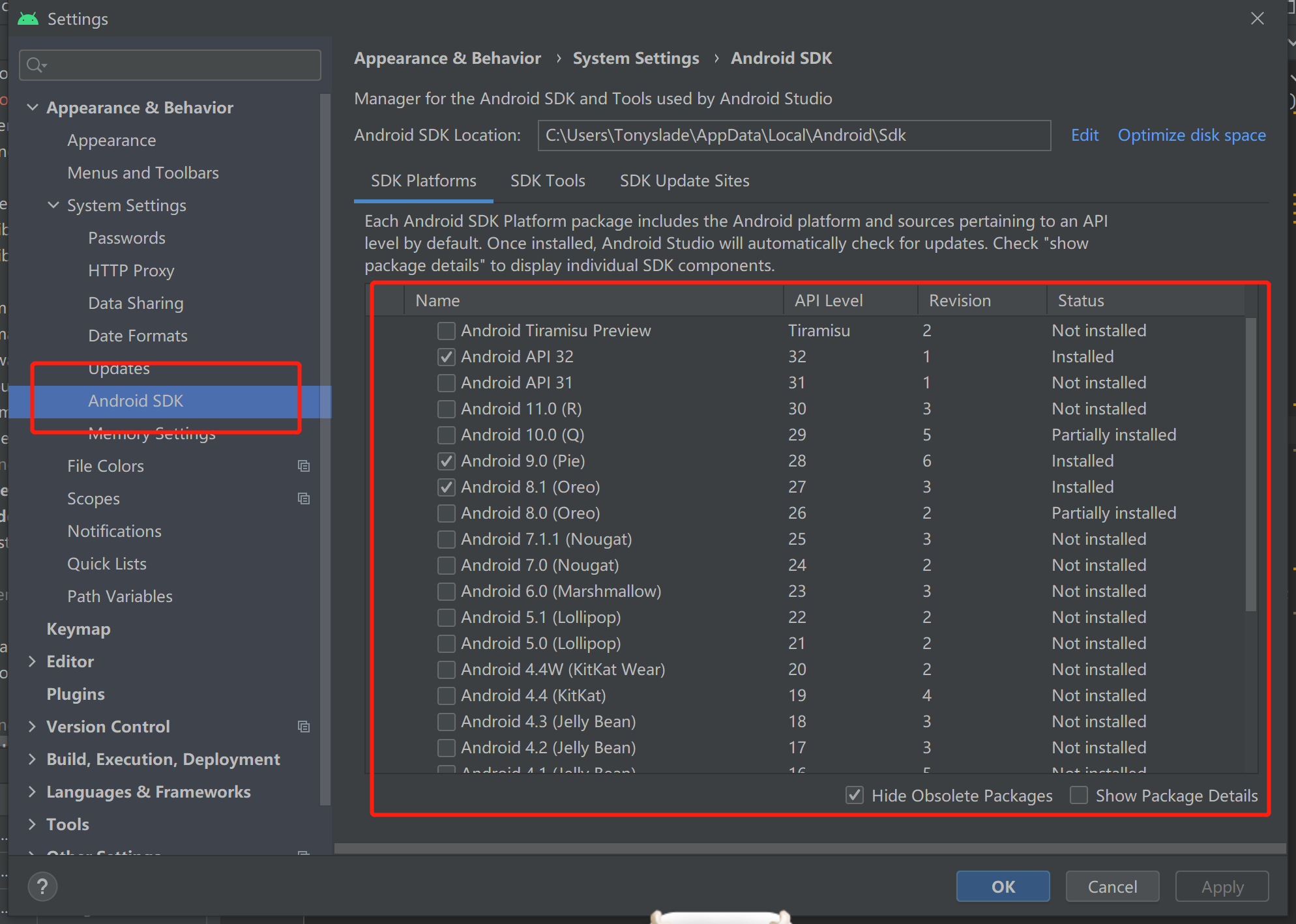 Andorid Studio安装后并打开,选择File-Settings打开设置,选择需要安装的SDK版本并安装