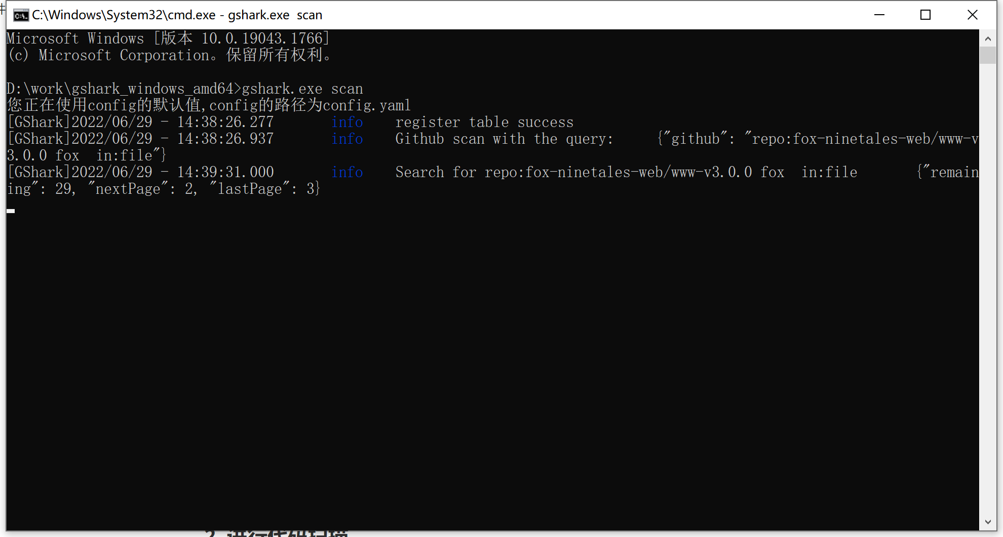 使用cmd进入gshark_windows_amd64解压目录,调用 gshark.exe scan 命令,启动gshark的扫描功能,扫描功能耗时比较长,耐心等待即可。